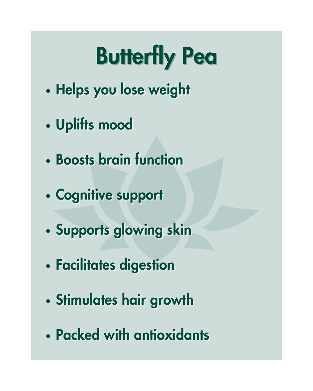 Butterfly Pea is a vibrant flower that supports relaxation and promotes a calm, balanced mood. Rich in antioxidants, it also helps with skin health, stress relief, and mental clarity.